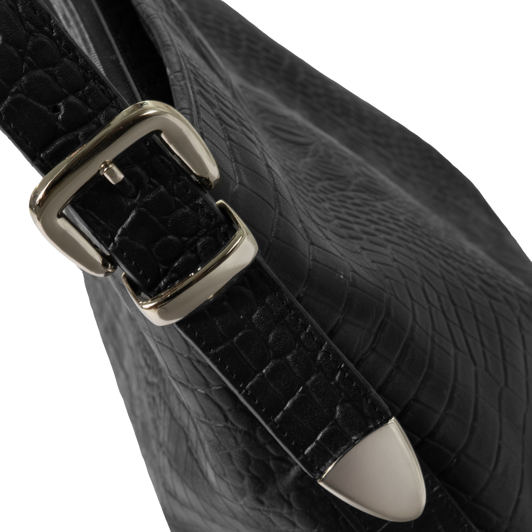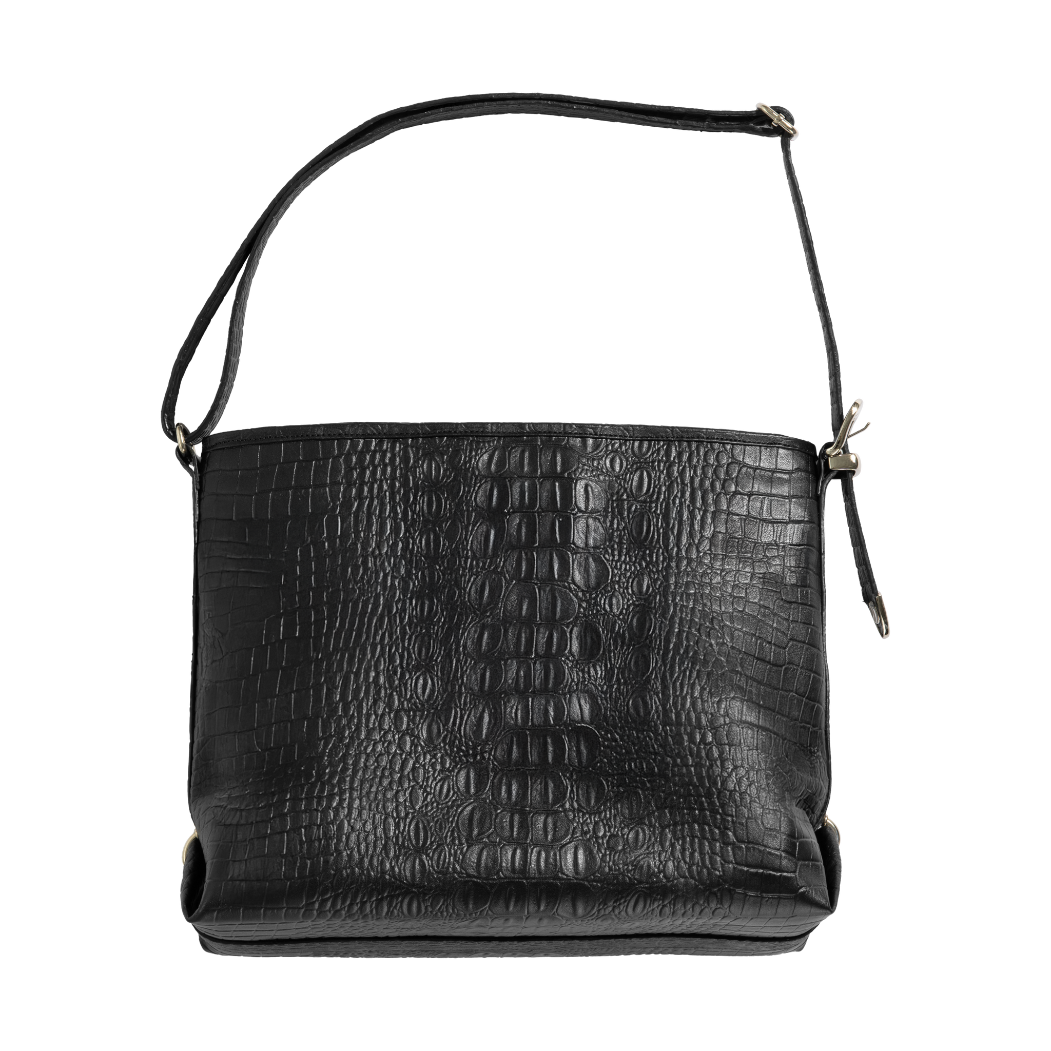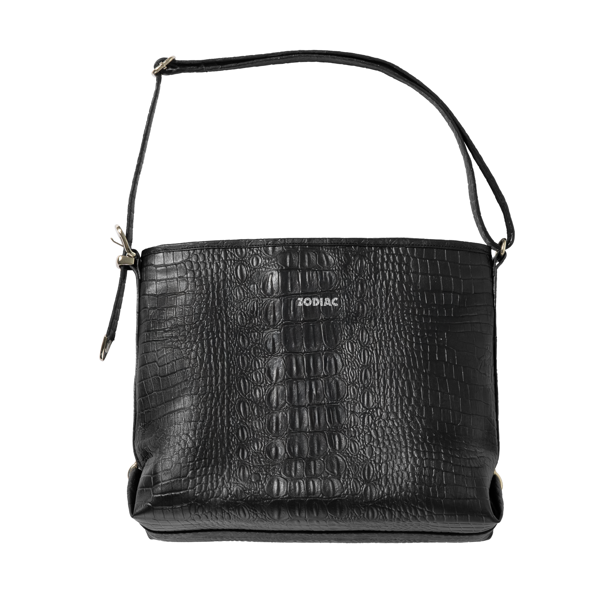 Cowhide leather, adjustable strap, logo on the front, zip closure, metal on the bottom.