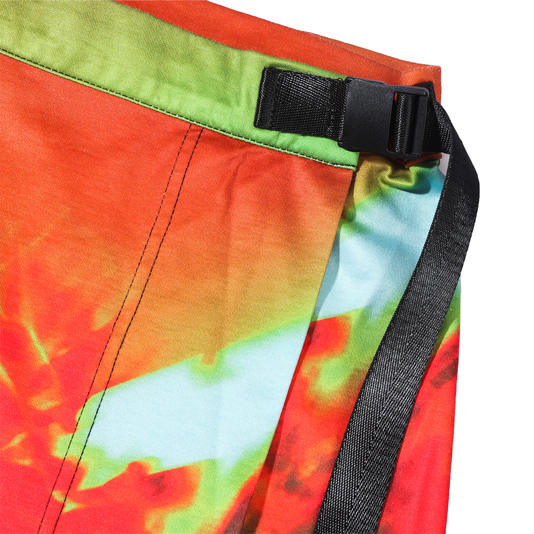 70% polyester, 30 cotton, printed fabric, adjustable belt.